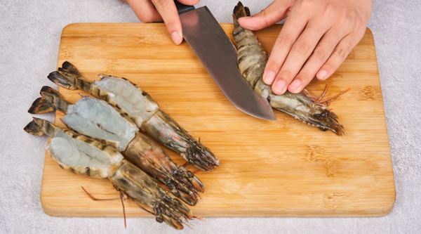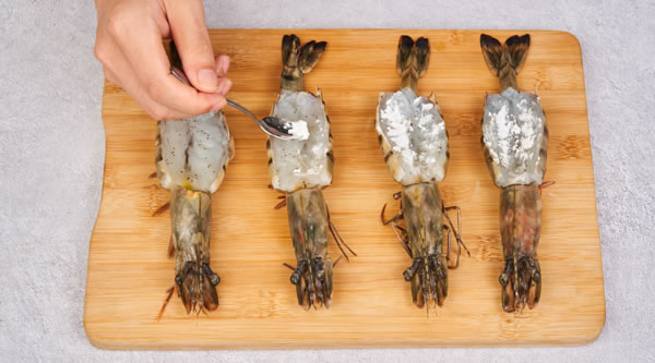 STEP 02大蝦去須洗凈,開背并打花刀使其更入味,用廚房紙巾吸干表面水份 -