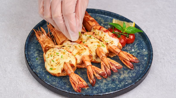 STEP 04每只大蝦上均勻抹上約30g白汁醬,豎放在淺盤中央位置 -