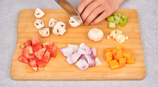 STEP 01洋蔥切小塊、胡蘿卜切小塊、口蘑一切四、番茄切小塊、西芹切2*2丁、蒜瓣拍碎備用 -