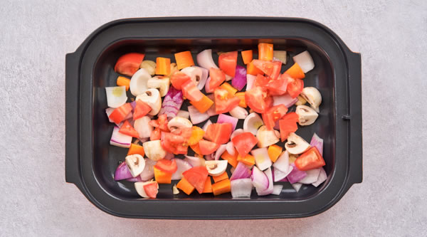 STEP 03深盤淋上橄欖油,放入蒜瓣、洋蔥塊、胡蘿卜塊、口蘑塊、番茄塊。 -