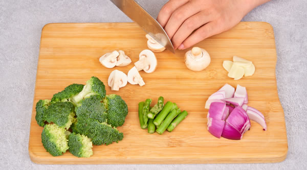 STEP 01將西蘭花切小塊,蘆筍切3*3的段、口蘑和紫皮洋蔥分別切為2*2的塊、蒜瓣切片 -