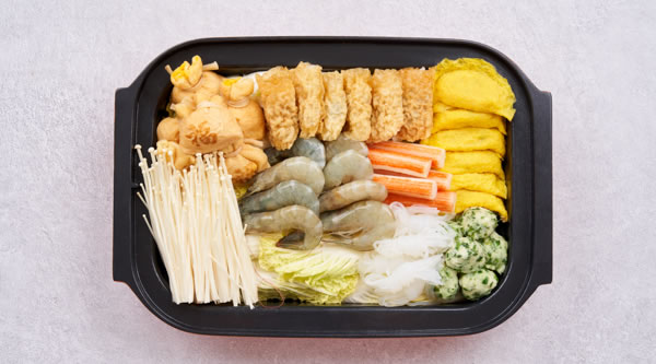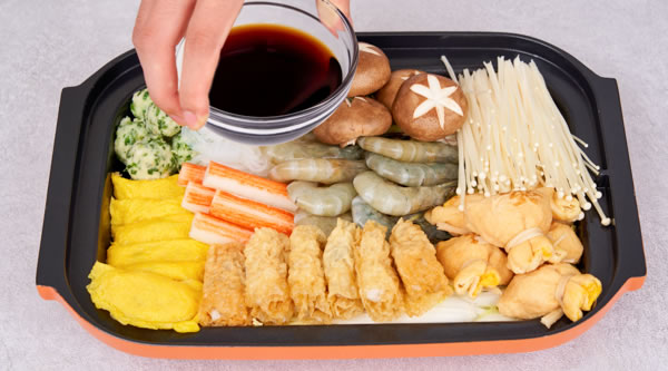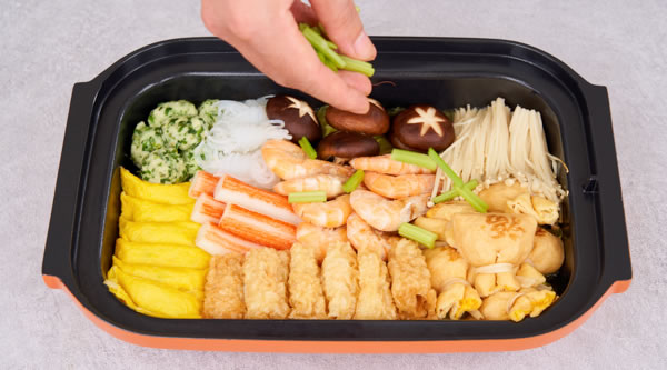 STEP 02均勻鋪上蟹柳棒、蛋餃、響鈴蝦滑、魚籽福袋、薺菜魚丸、鮮蝦、魔芋結(jié)、金針菇 -
