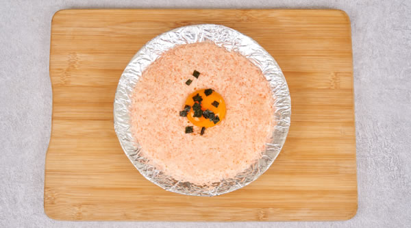 STEP 05取出在山藥泥中央位置放可生食雞蛋黃,撒上海苔碎即可拌勻食用