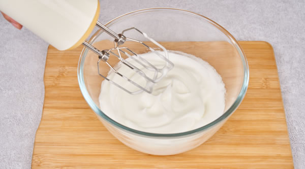 STEP 02蛋清加入檸檬汁、將糖分3次加入,用電動(dòng)打蛋器打發(fā)至細(xì)膩光滑可起勾狀 -