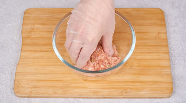 STEP 01肉糜中加入全蛋液、蔥白花、姜米粒、鹽、糖、蠔油拌勻打上勁成肉餡 -