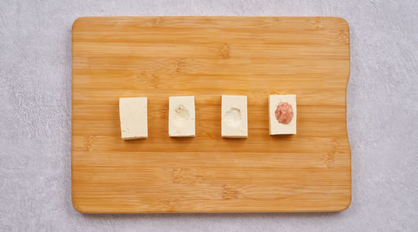 STEP 02鹵水老豆腐切成每塊約50g,3cm*6cm,2cm厚,每塊中間挖孔均勻撒上生粉,釀入約15g肉餡 -