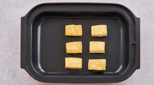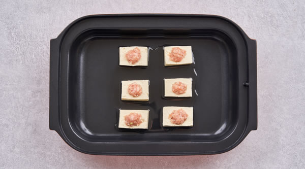 STEP 03深盤(pán)加入食用油,放入釀好的豆腐 -