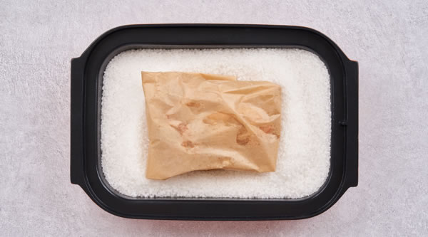 STEP 04用烘焙油紙將乳鴿包裹起來,用勺子在鹽中間挖出空間放入包好的乳鴿 -
