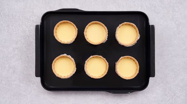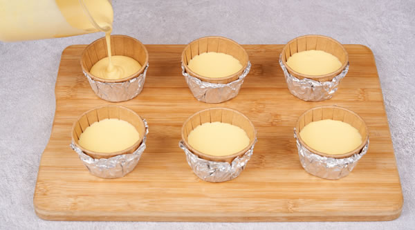 STEP 04高紙杯托,外部用錫紙包裹,每個(gè)加入約70g奶酪糊 -