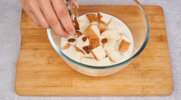 STEP 02加入牛奶、糖、鹽、葡萄干與吐司片一起浸泡約20分鐘 -