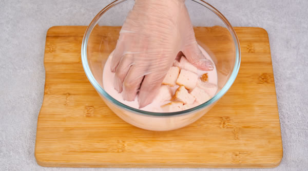 STEP 04加入草莓奶,與吐司一起浸泡約20分鐘 -