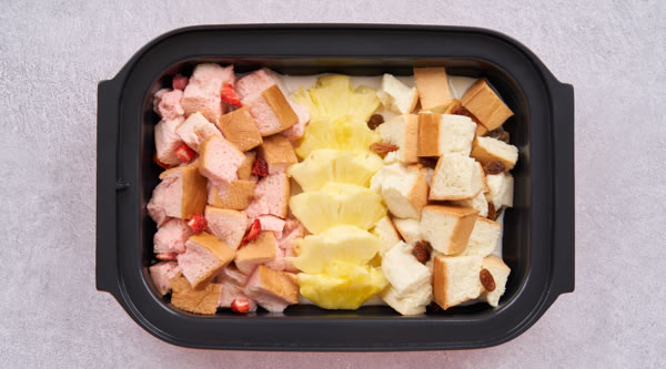 STEP 05深盤中央位置放上菠蘿片,左右各放入調(diào)好的吐司奶液 -