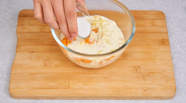 STEP 05加入淡奶油、20g馬蘇里拉、糖、鹽攪勻 -