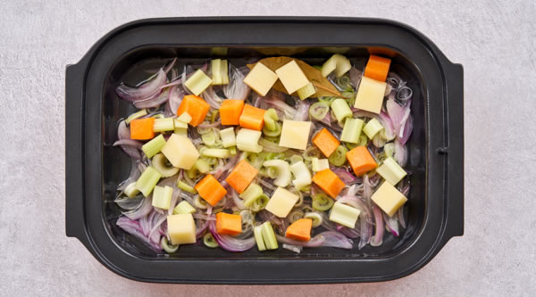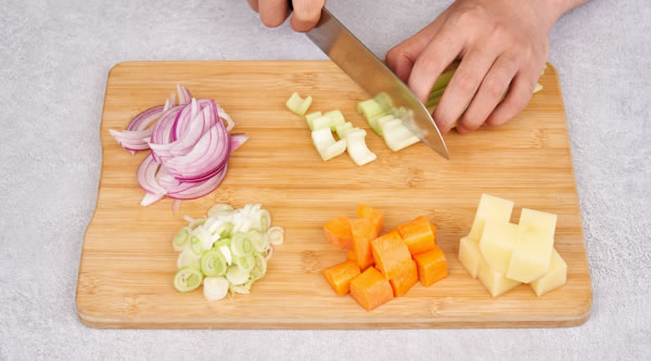 STEP 01洋蔥切絲、京蔥切絲、西芹切2*2段、胡蘿卜2*2立方塊、土豆2*2立方塊 -