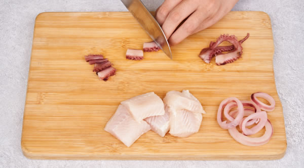STEP 02魷魚圈切2cm圈、龍利魚切4cm塊、八爪魚腿切2cm段 -