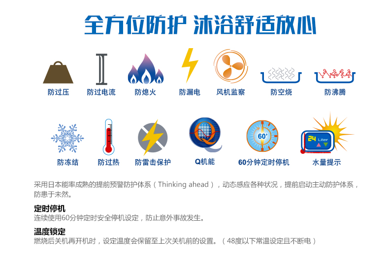 安全裝置:熄火安全、防空燒安全、停電時安全、防過熱、防過電流、防過壓安全、風扇轉(zhuǎn)速檢測、防沸騰、防漏電安全、60分鐘定時停機保護、防凍裝置