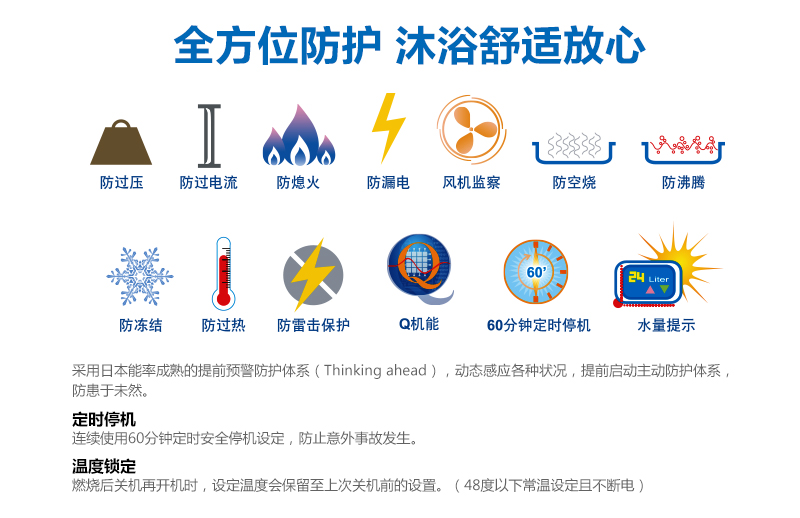 安全裝置:熄火安全、防空燒安全、停電時安全、防過熱、防過電流、防過壓安全、風(fēng)扇轉(zhuǎn)速檢測、防沸騰、防漏電安全、60分鐘定時停機(jī)保護(hù)、防凍裝置