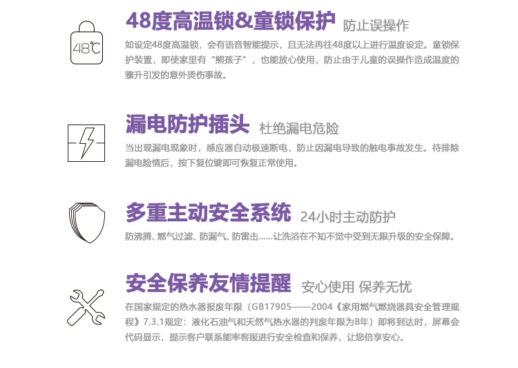 安全裝置:熄火保護、過壓保護、可復(fù)式空燒保護、水及氣路過濾、熔斷式過熱保護、LED數(shù)碼故障顯示、斷水保護、防雷擊保護、雙重燃氣電磁閥等等安全保護裝置。