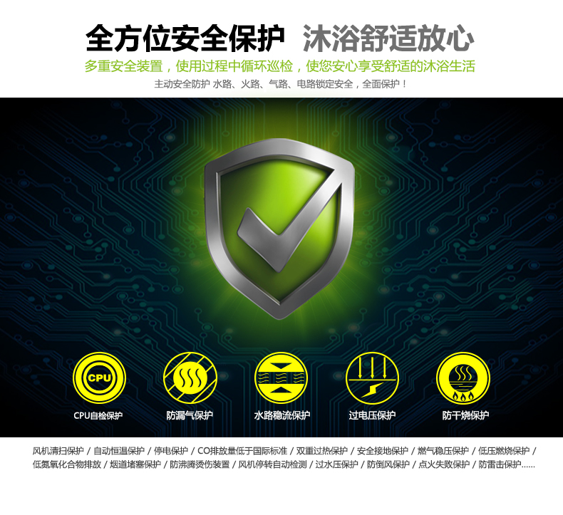 安全裝置:防空燒保護(hù)、過熱保護(hù)、過壓保護(hù)、熄火保護(hù)、排煙管堵塞保護(hù)、定時(shí)熄火保護(hù)、水路防堵塞保護(hù)、LEO數(shù)碼管指示報(bào)警、斷水保護(hù)裝置、雙重燃?xì)怆姶砰y等
