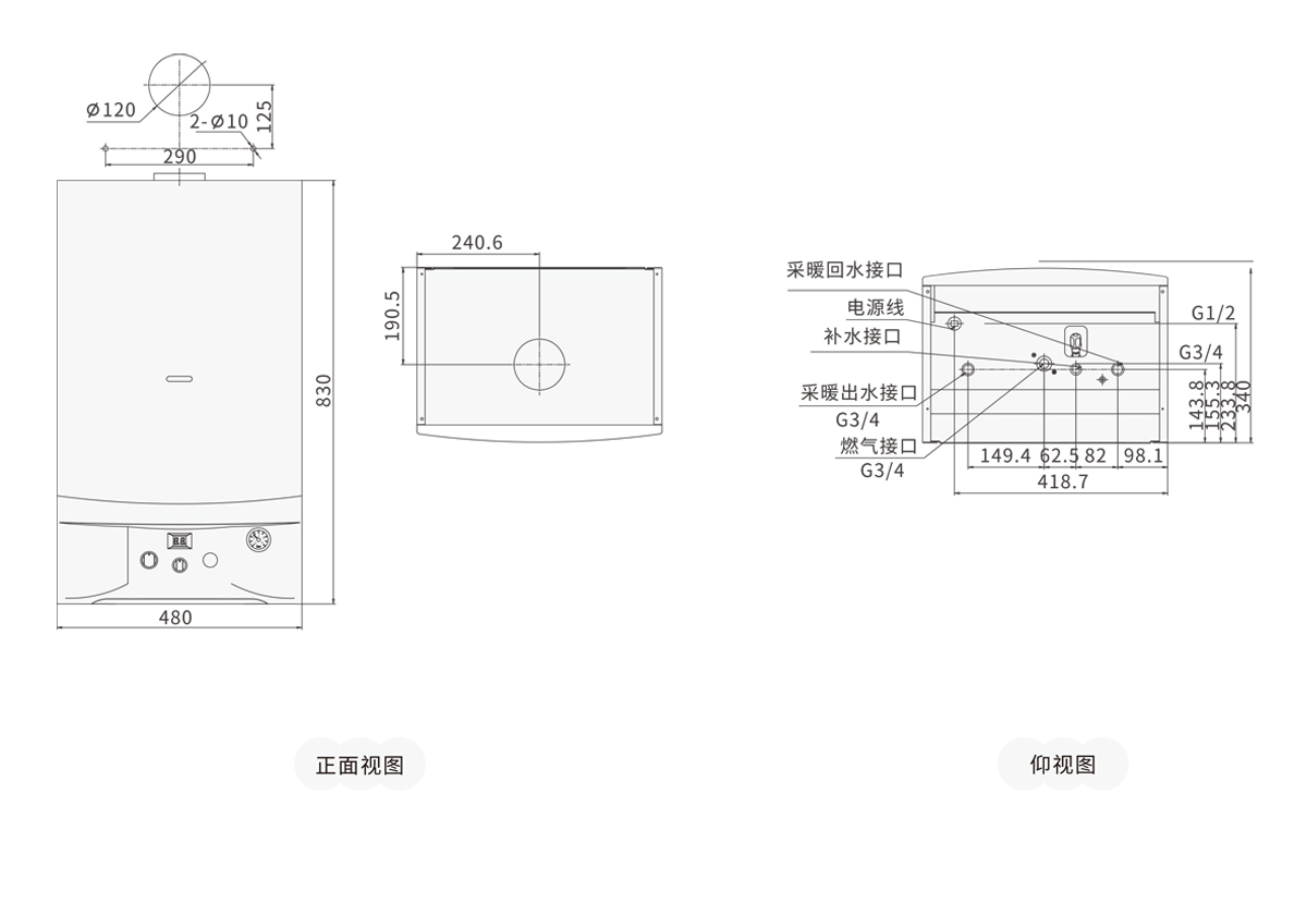 接口:燃?xì)?DN20、采暖(℃)進(jìn)出水 DN20、補(bǔ)水口 DN15