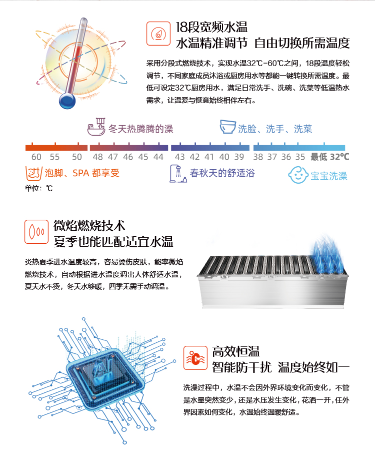 • 32度微焰燃燒技術(shù) 炎熱夏季也有舒適水溫
