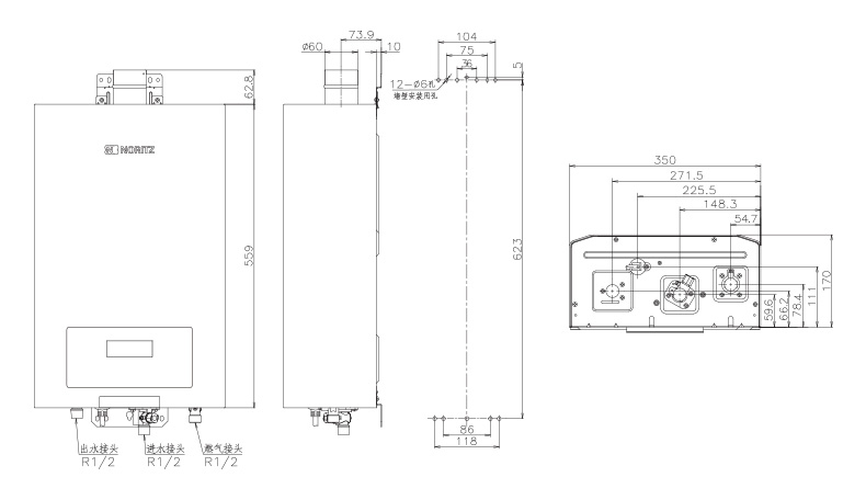額定熱負(fù)荷(kW)時(shí)產(chǎn)熱水量(Kg/min):11(水溫+25℃上升)