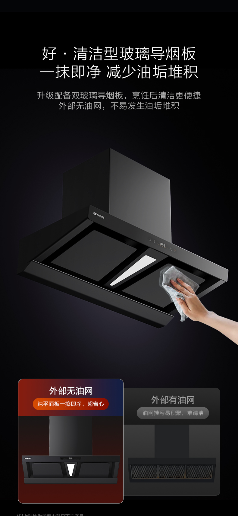• 雙玻璃導(dǎo)煙板 一抹即凈好打理